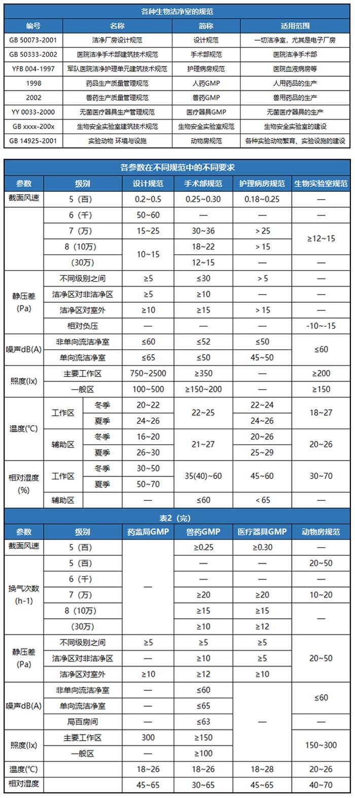 不同類型的生物潔凈車間必須遵循相應的規范要求,不了解這些規范,是無法進行設計施工的。目前針對不同類型生物潔凈車間的一些規范如表1所列。只有熟悉各行業的特點,充分掌握各規范的要求,才能切實做好生物潔凈車間的設計、施工、調試等工作。表中將各參數作了詳細的比較。應當指出,表中的參數要求并不詳盡,應以原規范為準。