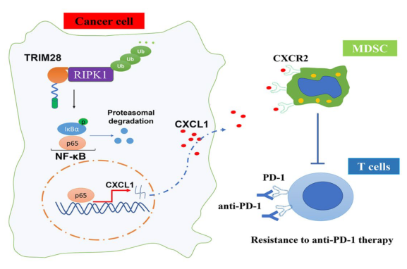 近日,來自皖南醫學院的研究者們在J Exp Clin Cancer Res.雜志上發表了題為“E3 ligase TRIM28 promotes anti-PD-1 resistance in non-small cell lung cancer by enhancing the recruitment of myeloid-derived suppressor cells” 的文章,該研究表明TRIM28通過ripk1介導的NF-κB激活,作為趨化因子驅動的MDSCs募集的啟動子,導致浸潤性活化CD8+T細胞受到抑制,并產生抗pd -1耐藥性。